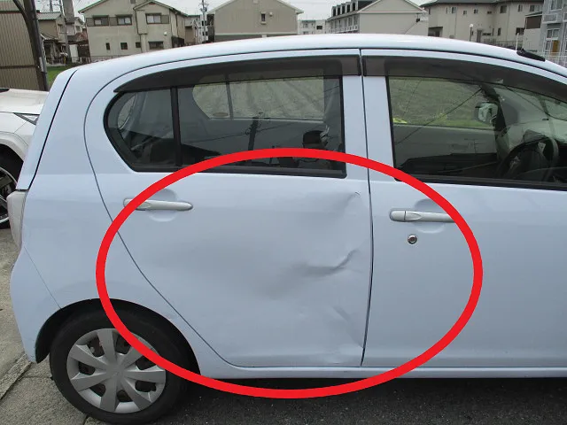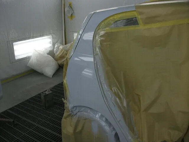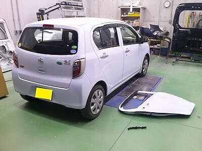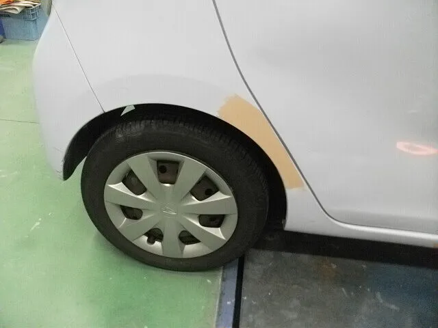 右後部損傷のミライースが入庫しました。リアのドアは取り替え、リアフェンダー、右サイドシルは修理です。凹んだフェンダーとサイドシルはパテ入れして鈑金。ドアも素材色のものを塗装し、組付けてキレイに仕上がりました。