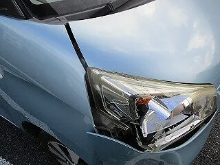 右前が大きく凹み、ヘッドランプが割れています。ボンネットを開くと内部にも割れや歪みがありました。