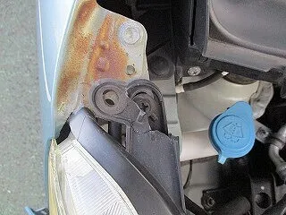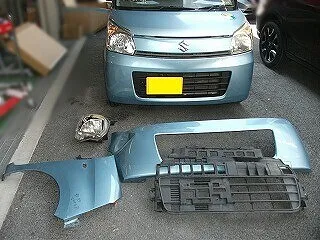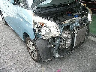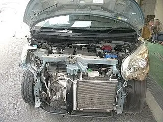 バンパー、ヘッドランプを取り外し、内部の歪みを矯正して破損した部品を交換。