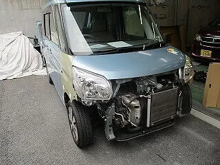 右前を損傷したスペーシアが入庫しました。右側のバンパー、右ヘッドランプ割れ、右フェンダーの損傷があり、内部も押されて損傷していました。今回は内部の部品取替え、修正とバンパー、フェンダー、ヘッドランプの取り替え修理になりました。