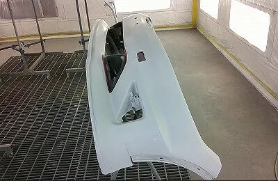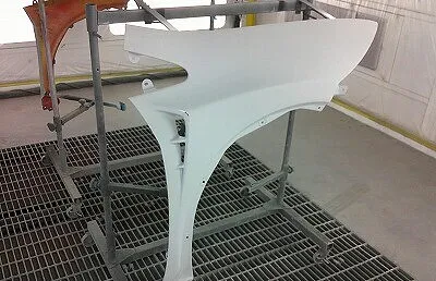 最初にパーツを取り外し、元の塗装を剥がします。その上にサーフェイサーを塗り(写真の白い部分)、サーフェイサーの上から塗装していきます。