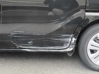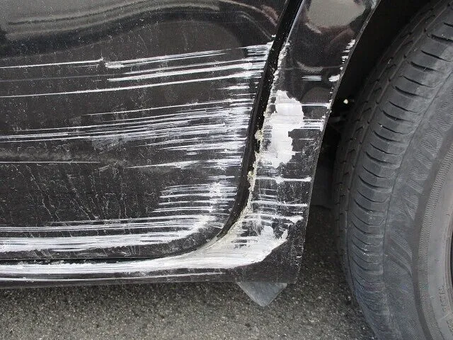 左のリアドア、サイドシル、リアフェンダーにかけて大きな擦りキズがあります。