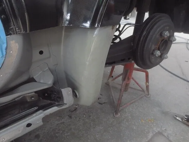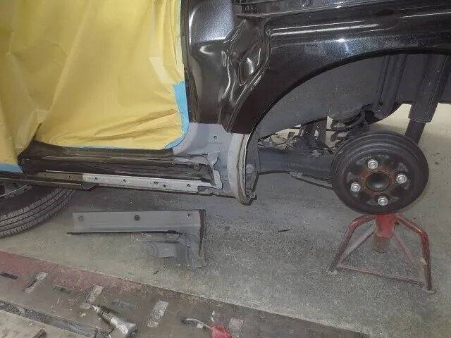 深くキズと凹みのあるサイドシル後部からフェンダーにかけて切除し、新しい部品を溶接していきます。その部分にパテを入れて平らにし、原型に戻ると塗装の準備をします。