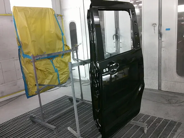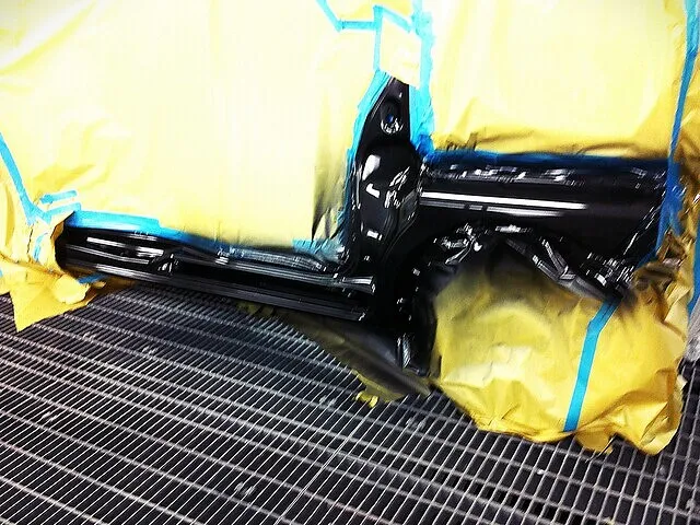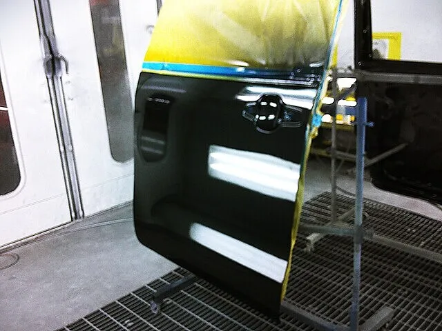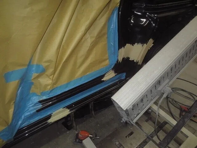 鈑金したサイドシル~フェンダー部分と新品のリアドア、色合わせの為にフロントドアも塗装していきます。
