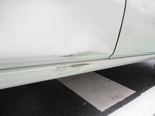 右フロントドアからリアバンパーにかけて広範囲に亘っての大きな凹みとキズがあります。今回は、右側のドア2枚の取替え、右リアフェンダーの取替え、リアバンパー、サイドシルの修理で進めていきます。