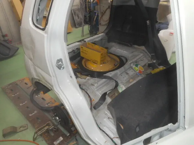 ドアやホイールを取り外し、押されてひしゃげたリアフェンダー内部を引っ張り出します。シートも取り外し、歪んだフロアも矯正。フェンダーからサイドシルの一部までを切断し、新しいパーツを溶接します。凹んだサイドシル残部も塗装を剥がしてパテを入れ補修します。結構大きな修理になりました。
