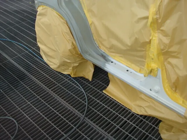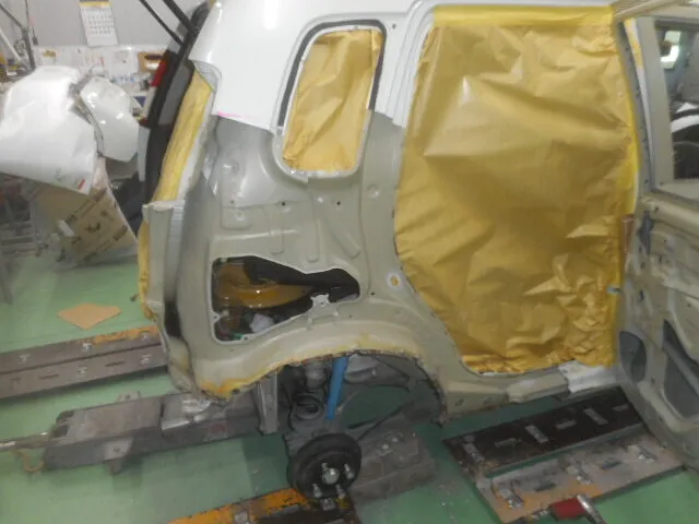 新しいパーツを溶接した車体にサーフェイサーを塗り、塗装していきます。フロントフェンダーも色合わせの為に塗装していきます。