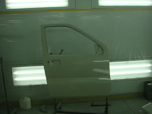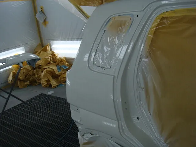 新しいドアを仮組して立て付けを確認してからドア2枚を塗装、およびバンパーを塗装。