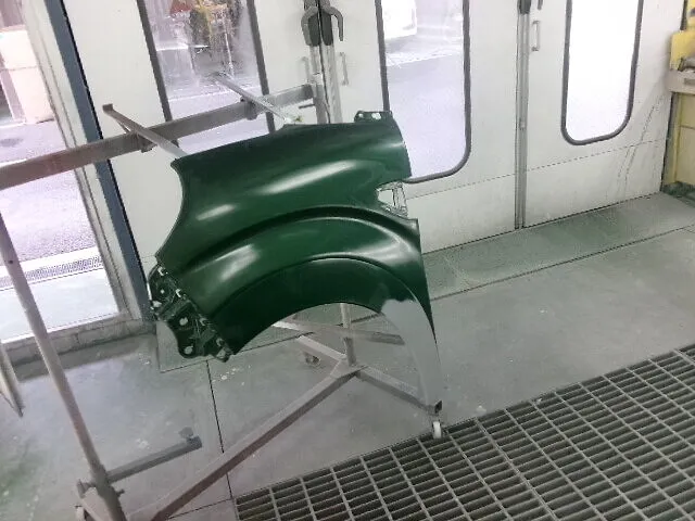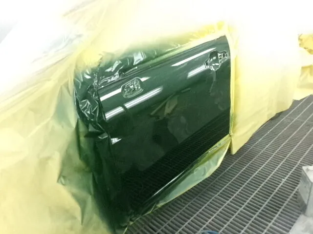 ドアとフェンダーを鈑金していきます。塗装を剥がして、キズをパテで修復。パテ面を平らにして、その部分にサフを入れます。