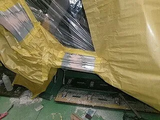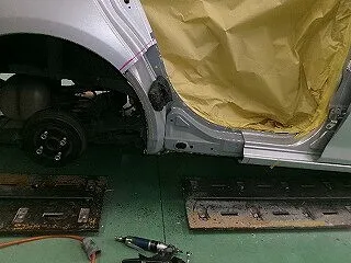 右リアドアと右サイドシルからリアフェンダーにかけて大きく凹んでいます。リアドアは取り替え、サイドシルとフェンダーの境目は切断して新品を溶接する修理で進めることになりました。