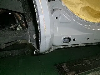 大きく凹んだサイドシルとフェンダー間の部分を切除。新しい部品をつなぎ合わせて溶接し、継ぎ目にパテを入れ平らにしていきます。