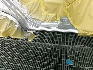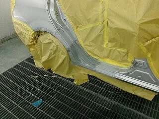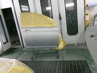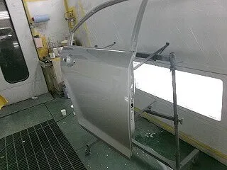 溶接した部分に防錆剤を塗り、塗装していきます。取替えの新しいドアも塗装。色合わせの為フロントドアも塗装しています。