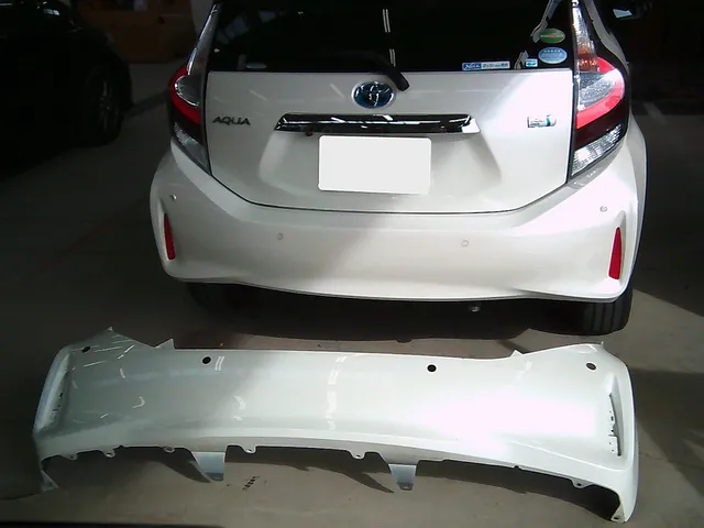アクアの割れてしまっているRバンパー…、リサイクルパーツを使っての交換作業です。