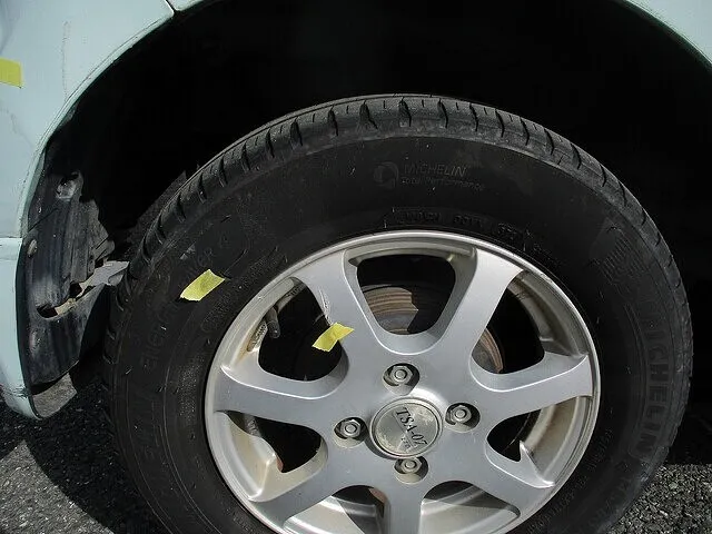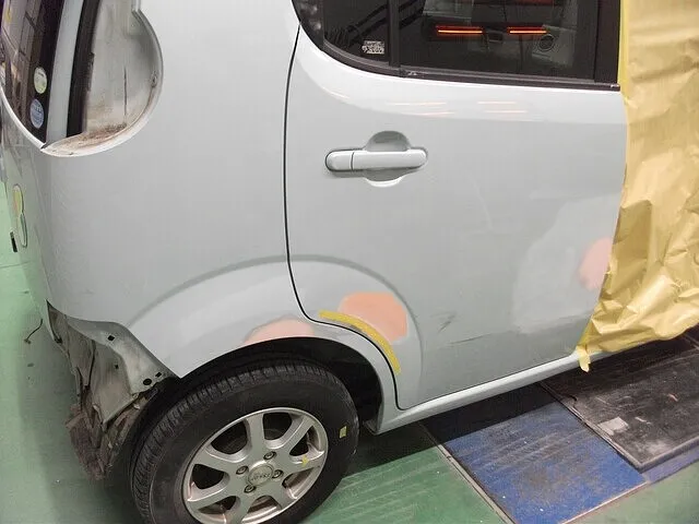 年式的に古くなり、新品での修理では時価額を大幅に超えてしまうので、鈑金修理とリサイクルパーツで金額を抑えることになりました。フロントバンパーは新品取替え、リサイクルパーツで右フロントドアとフェンダーを取替え、右リアドア、右リアフェンダー、右リアホイールは修理ですすめていきます。