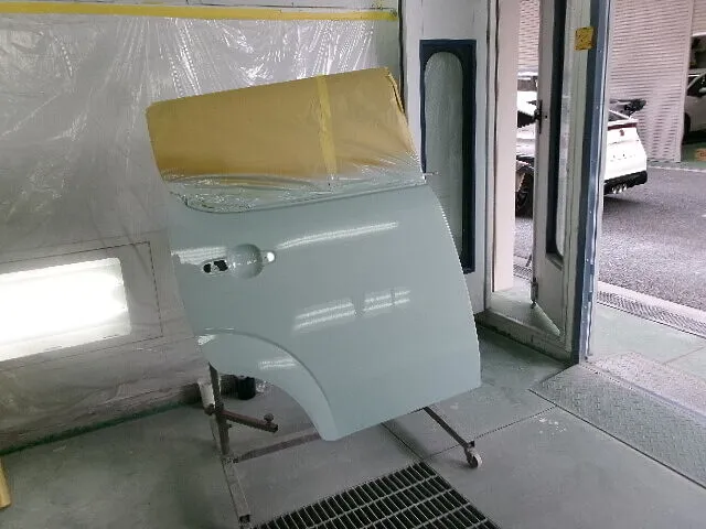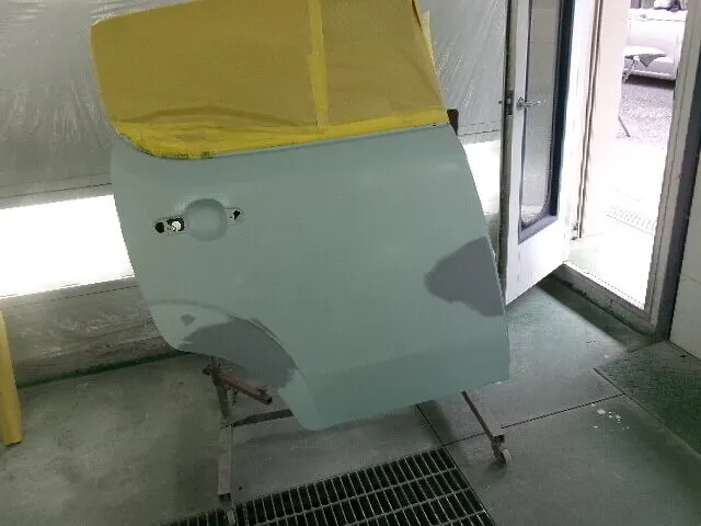 フロントバンパーは新品ですが色無しの為塗装、サフ入れしたリアフェンダーとリアドアも塗装。リサイクルパーツのフロントフェンダーも色違いの為塗装します。