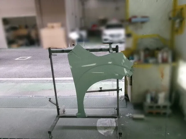 修理部分の塗装を剥がし、パテを入れて修復。修復部にサーフェイサー(錆止め)を塗ります。