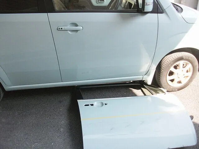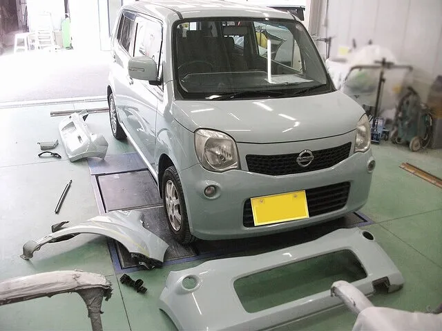 右側面損傷のモコが入庫。右側の前から後ろまで長いキズがありました。年式的に全損の可能性もあったため、リサイクルパーツの使用を考えました。