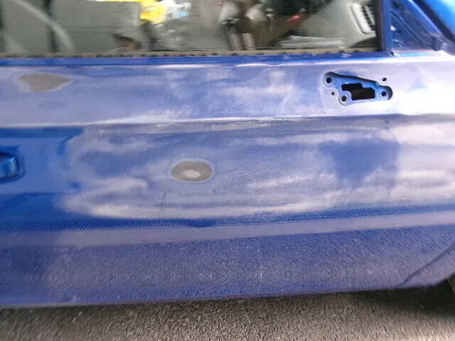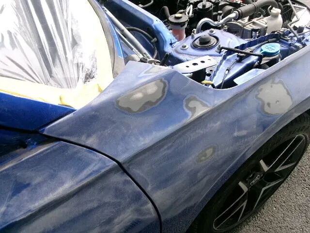 全体的にヘコミのある部分の塗装をはがし、面が平らになるようパテを入れます。